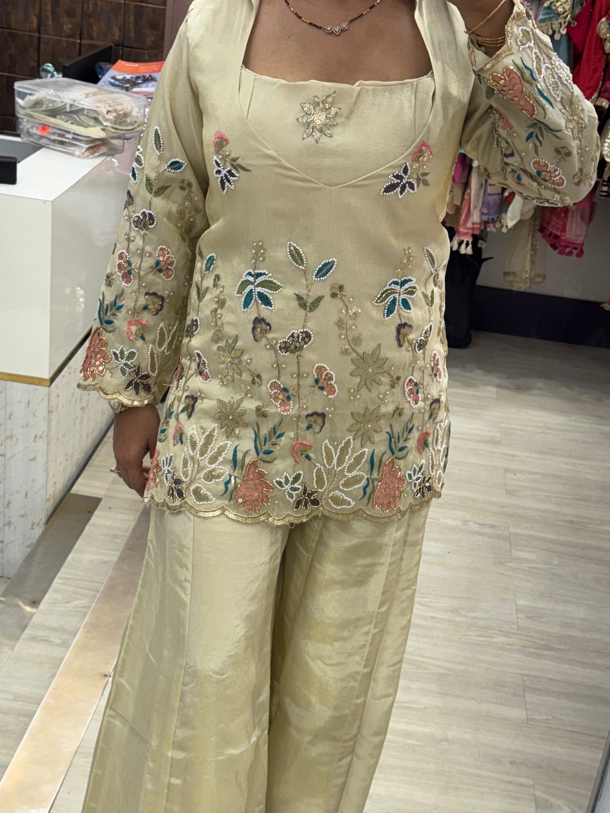 Beige Colour 3 Piece Co-ord Set with Multicolour Detailing