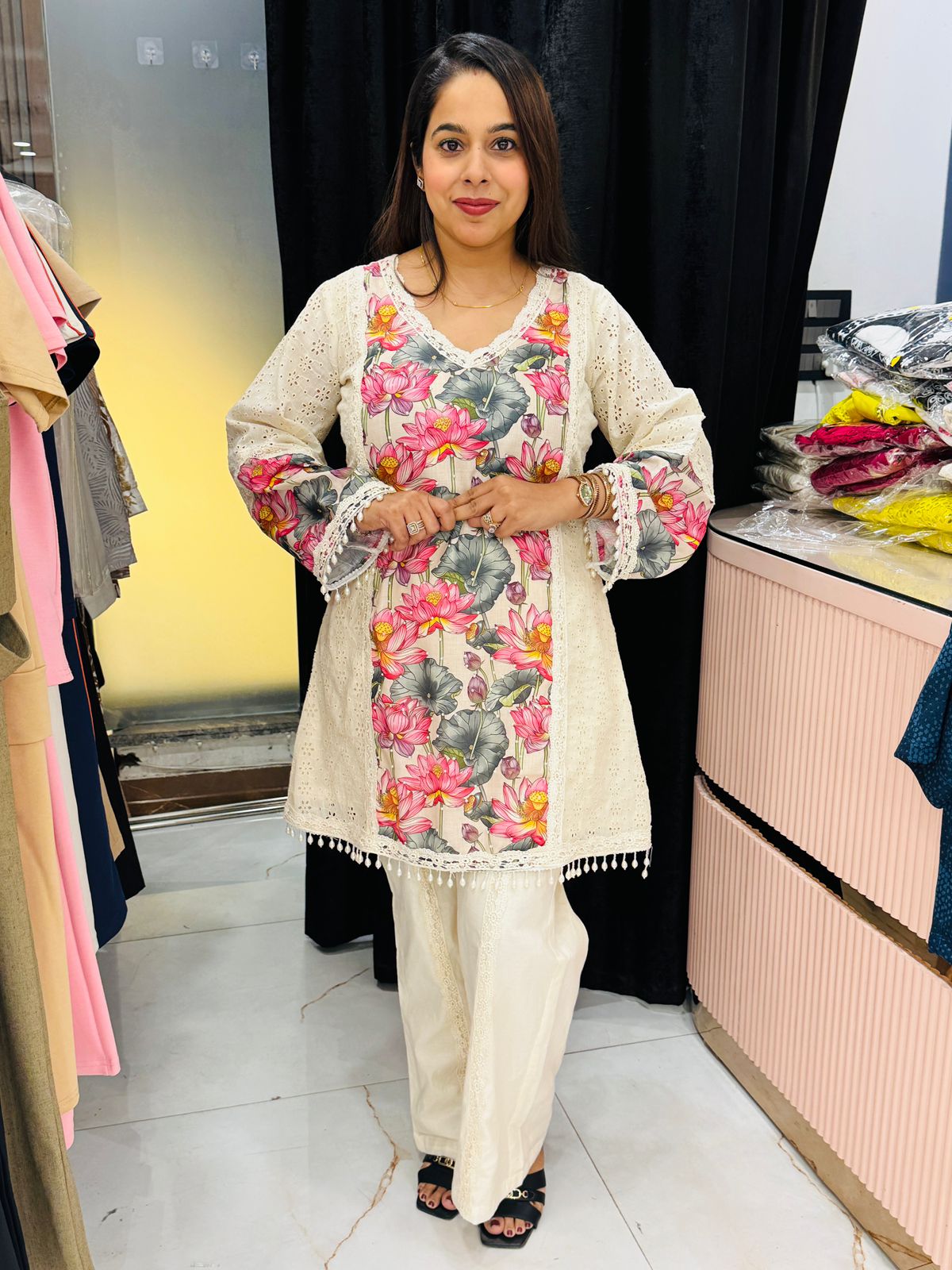 Gorgeous cream coord set with a vibrant floral printed center panel in pink and grey tones