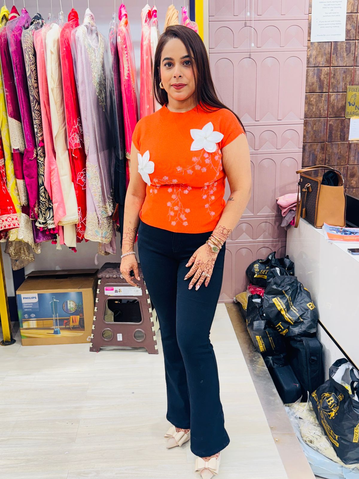 Trendy short-sleeve knit tops available in vibrant orange and lilac shades