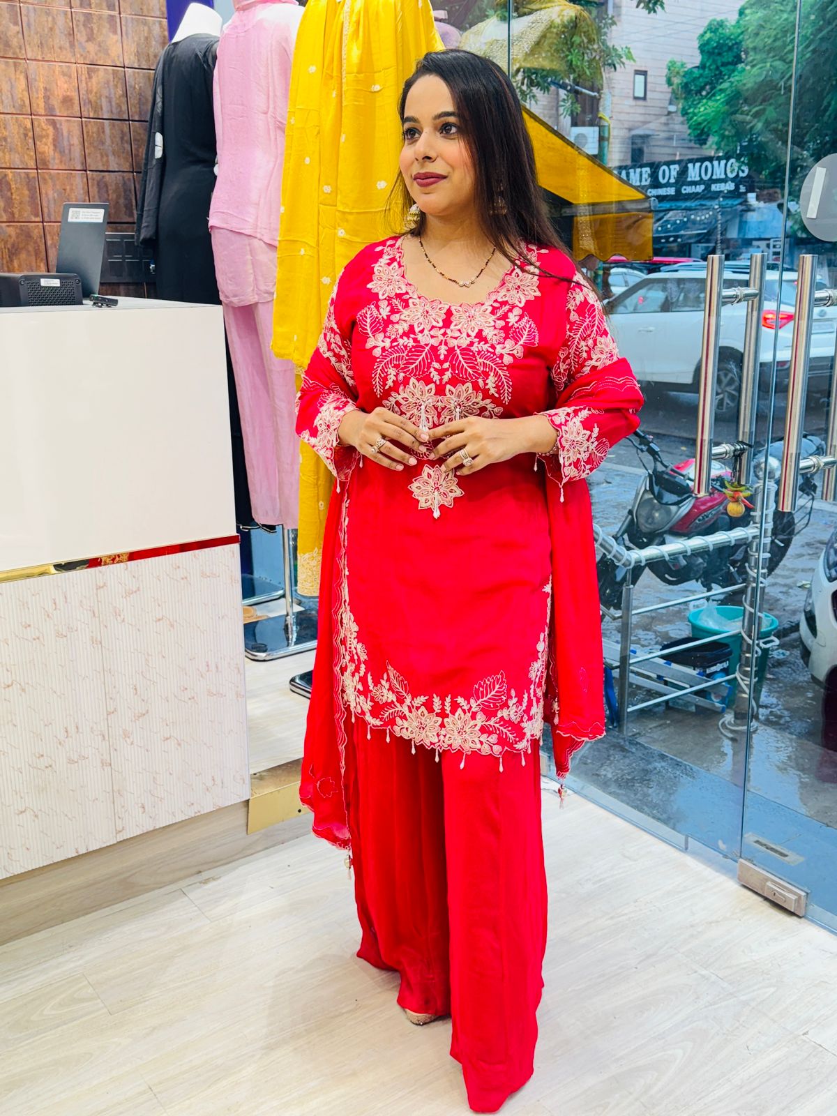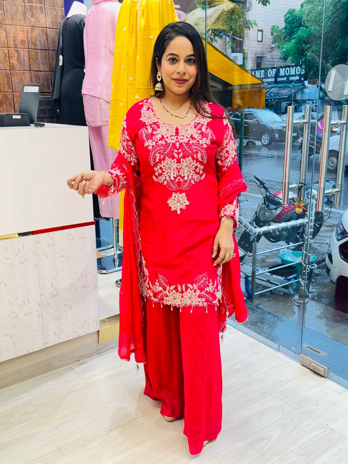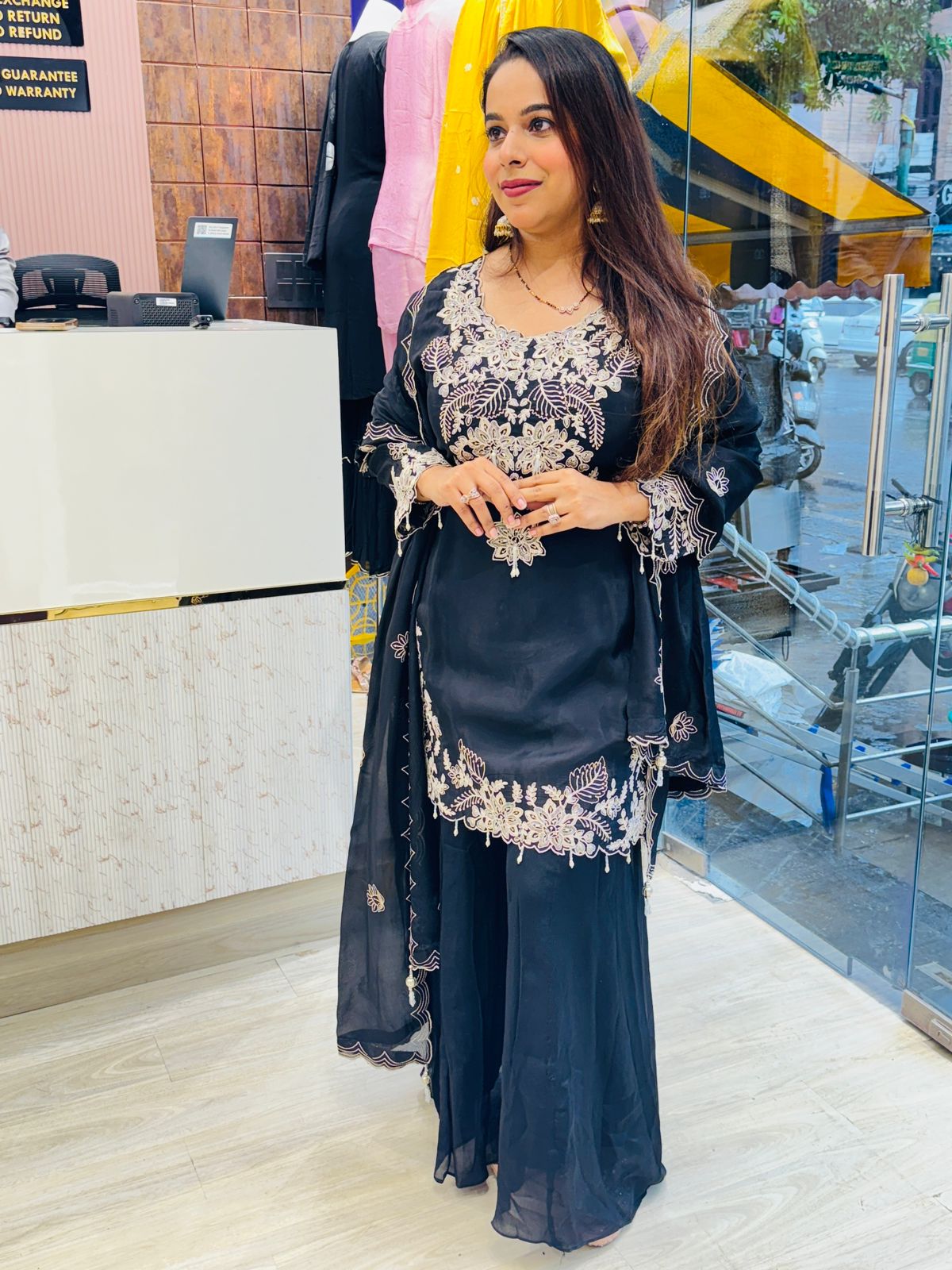 Detailed embroidery work on neckline and sleeves for a refined look