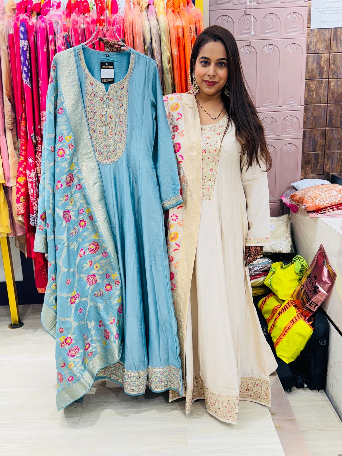 "Kashmeerah"- Embroidered Anarkali Suit Set With Floral Embroidered Dupatta (Available in 2 variants)