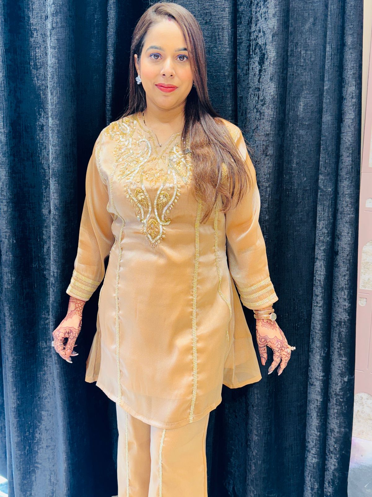 Beautiful stitched suit set in a rich coolours of beige, yellow and pink