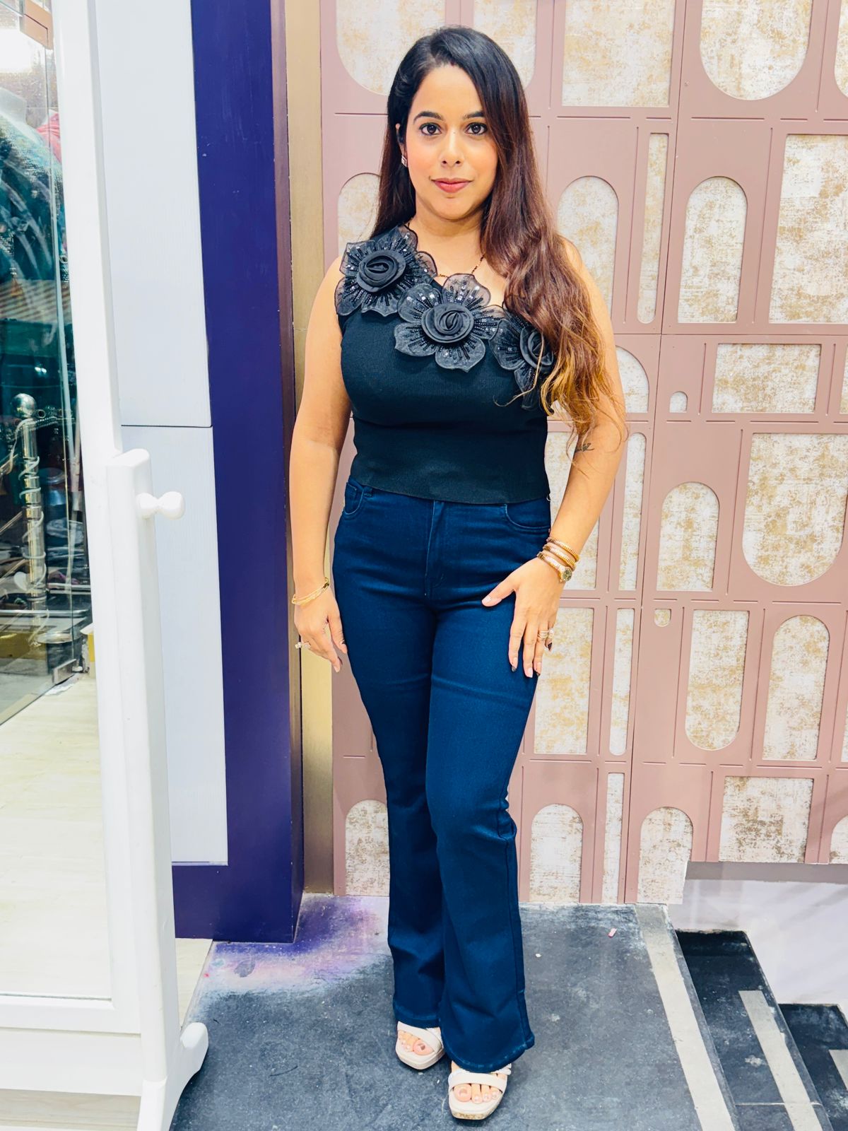 Embellished with 3D black floral appliqué with sequin detailing ✨
