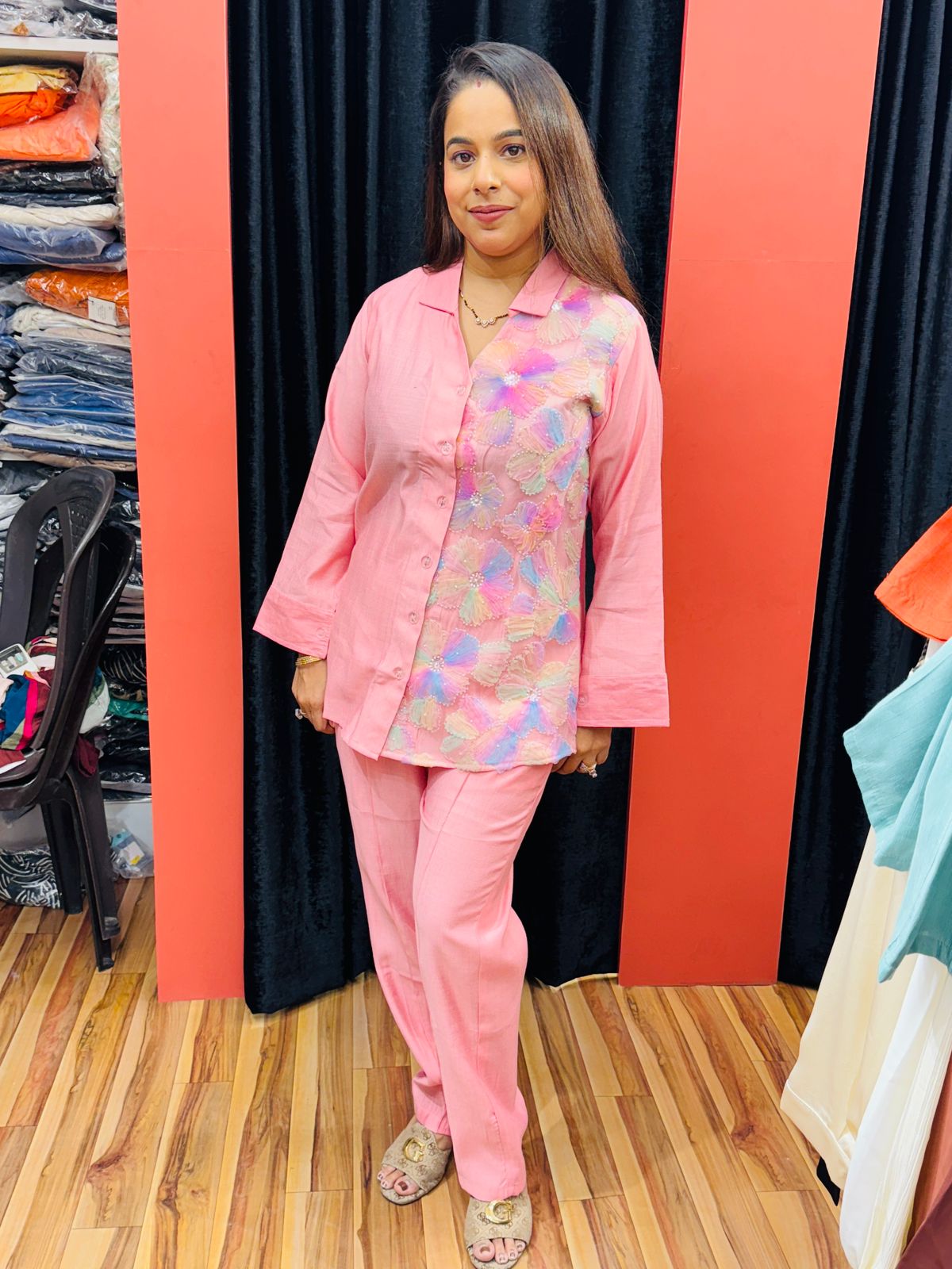Pastel Pink Cotton Co-ord Set with Abstract Sequin Embellishment